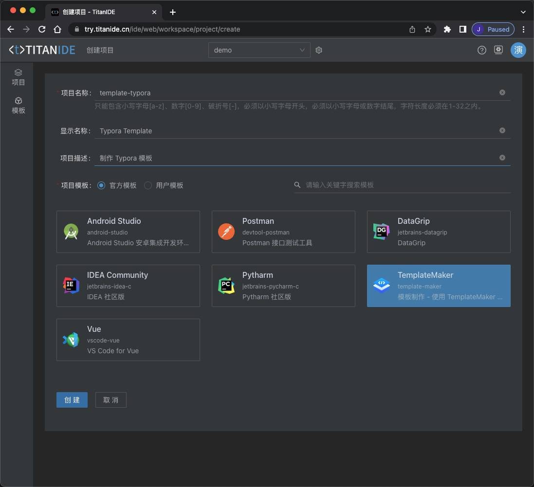 在安装好 TitanIDE 之后,通过自带的模板制作工具 TemplateMaker 创建一个项目,选择 TemplateMaker 模板创建一个项目 template-typora, 目的是制作一个容器镜像。