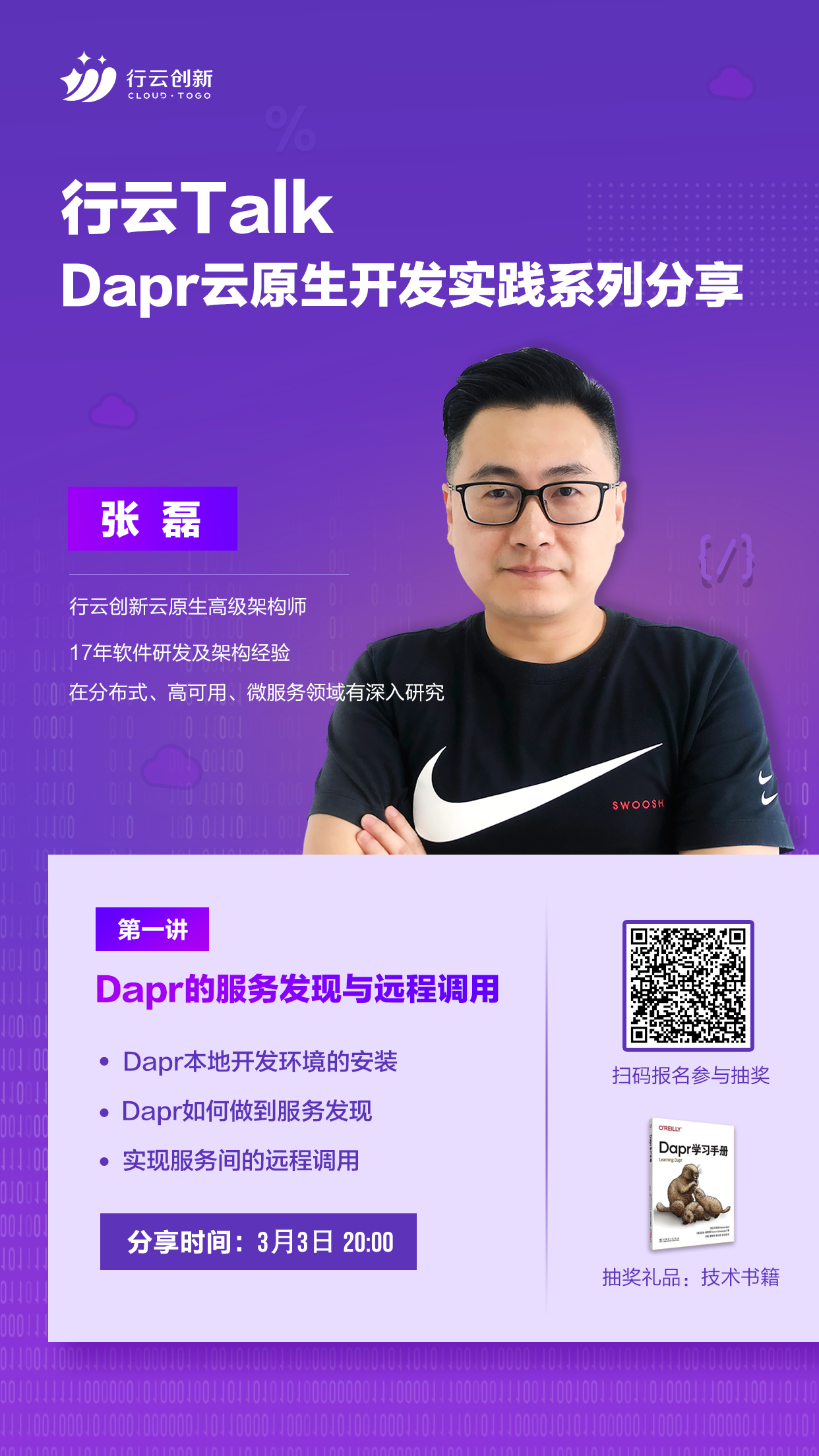 3月3日20:00,Dapr云原生开发实践系列第一期内容即将开讲,三亿体育生高级架构师张磊分享:Dapr的服务发现和远程调用,介绍Dapr本地开发环境的安装,Dapr如何做到服务发现以及实现服务间的远程调用。