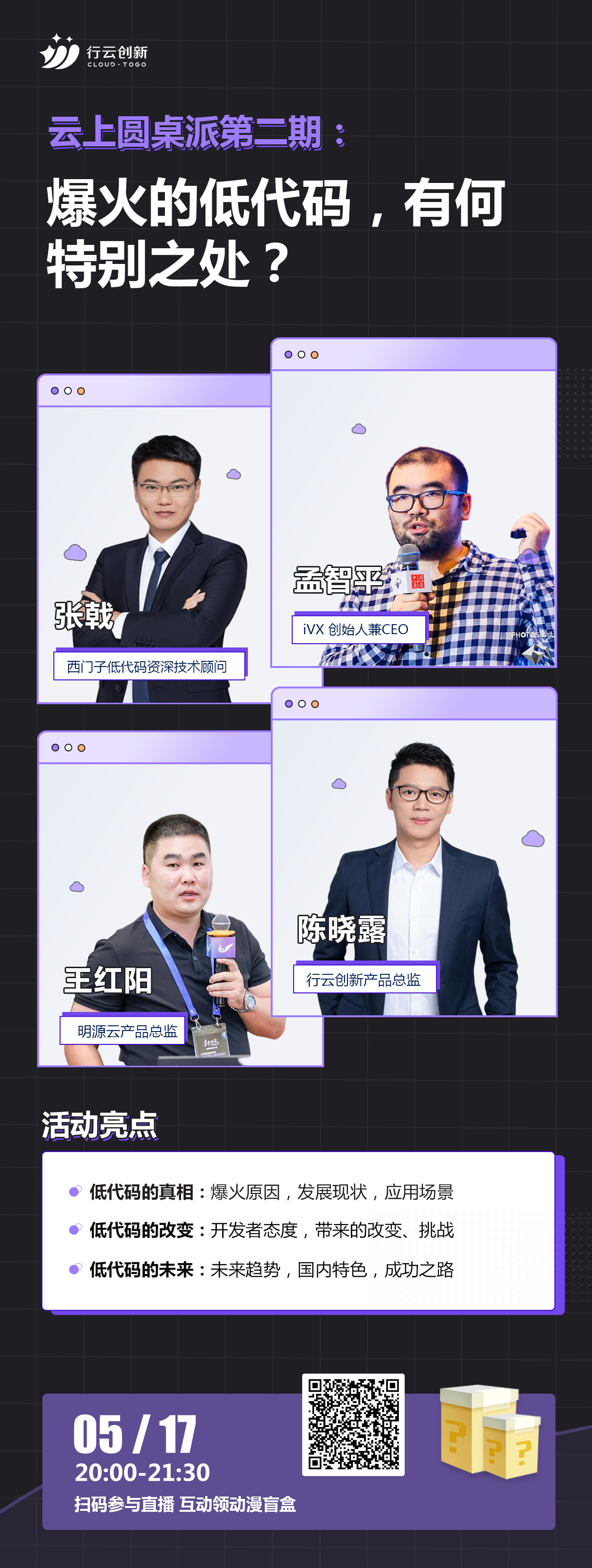 5月17日20:00《云上圆桌派第二期:爆火的低代码,有何特别之处》直播来啦!活动邀请西门子工业软件西门子低代码资深技术顾问张戟,iVX 创始人兼CEO孟智平,明源云产品总监王红阳,三亿体育总监陈晓露四位大咖和三亿体育三亿体育pan>马洪喜一起对低代码爆火背后的原因、开发者对低代码的态度、低代码带来的变化和应用场景等多个话题展开讨论。