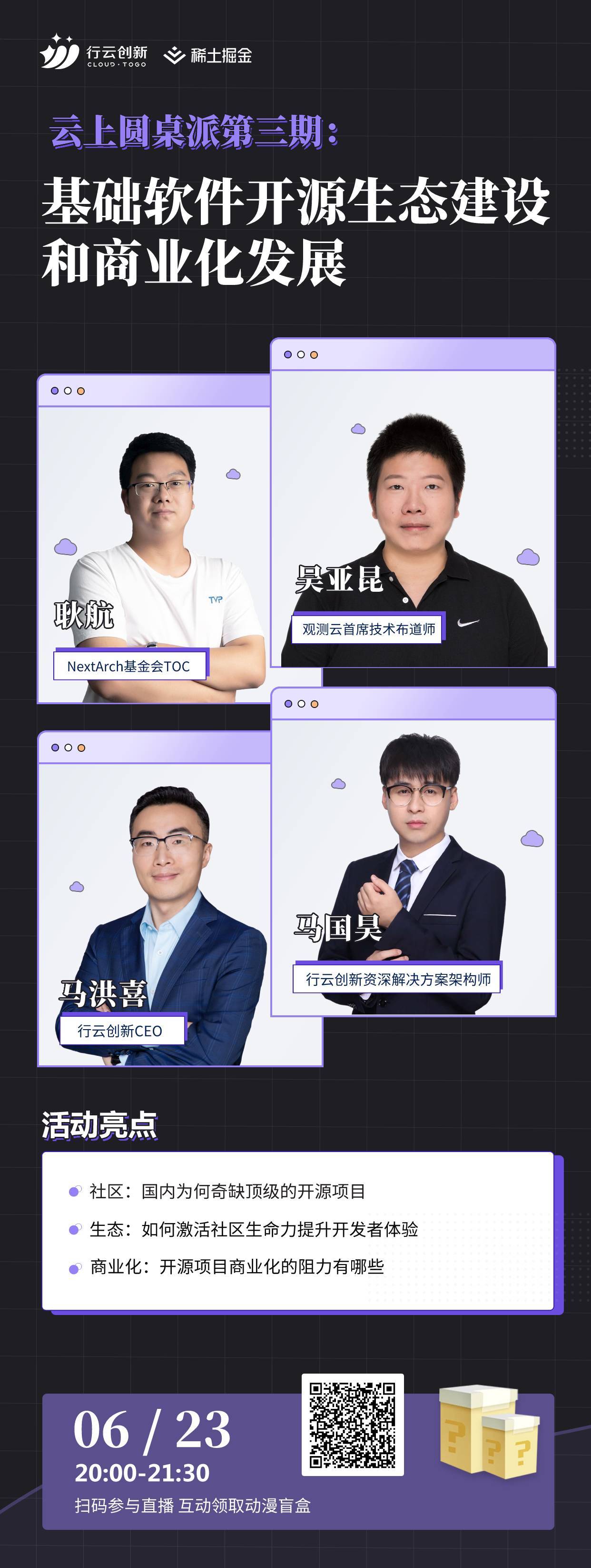 6月23日晚上20:00,云上圆桌派第三期《基础软件开源生态建设和商业化发展》即将开启,活动邀请NextArch基金会TOC耿航,观测云首席技术布道师吴亚昆,三亿体育解决方案架构师马国昊三位大咖和三亿体育三亿体育一起对国内的开源生态现状、社区的建设及商业化发展等多个问题一起展开讨论。
