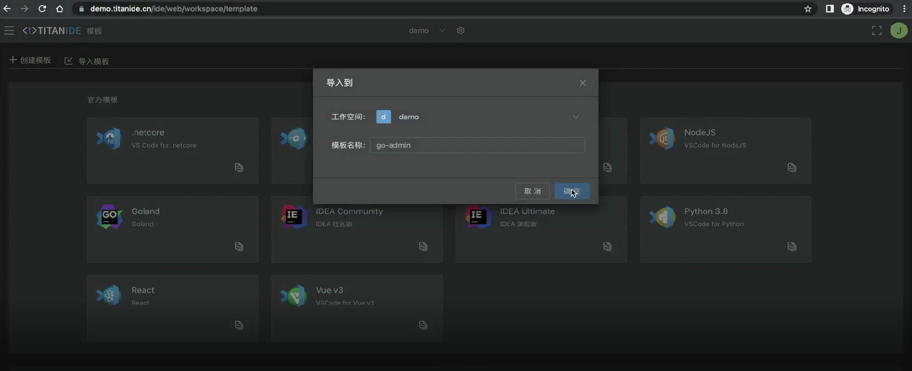 Go Admin,这个项目依赖了中间件服务 MySQL,Go语言开发工具等等,对于初学者来说,肯定有一定的学习门槛,我在 [TitanIDE] 上使用自定义模板来配置了一个 Go Admin 的开发环境,一个有经验的开发者在笔记本电脑上配置这个开发环境至少需要半天时间到一天时间,但是,通过 [TitanIDE] 预置好的模板,仅仅需要 1 分钟。